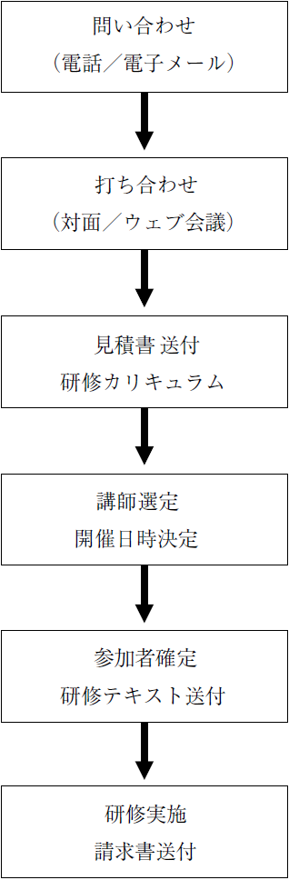 打ち合わせで伺った内容に基づき、研修カリキュラムの概要と、見積書を作成して送付します。 見積書を承認いただいた後、講師を選定し、開催日時を相談のうえ決定いたします。参加者の確定後、研修に使用するテキストや資料を送付します。研修終了後、請求書を送付します。研修実施までには3〜4ヶ月ほどお時間をいただいておりますので、その時期にお問い合わせいただけますと、十分な準備が可能です。